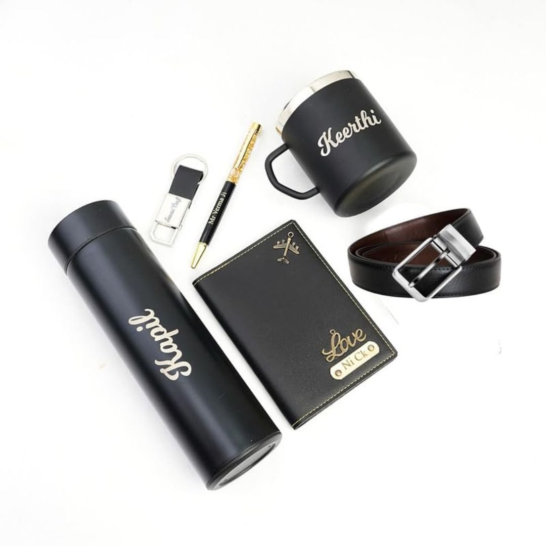 Make gifting personal and memorable with this all-in-one customized gift set! Perfect for birthdays, anniversaries, corporate giveaways, or special occasions, this set includes a personalized water bottle, coffee mug, passport cover, pen, keychain, and a stylish men’s belt. Each item can be customized with a name, initials, or a short message, adding a unique touch that shows you care. Crafted with high-quality materials, these products are both practical and stylish—perfect for daily use or keeping as a keepsake.